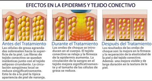 Al aplicarse las AWT, se introducen en capas profundas de la epidérmis, dérmis y tejido celular subcutáneo, además de su efecto en la eliminación de grasa localizada (abdomen, brazo, espalda, glúteo, etc), reafirma la piel de la zona tratada, siendo un tratamiento de alta eficiencia para Celulitis (en todos sus tipos y grados) al estimular biomecánicamente el tejido conjuntivo, el cual da la apariencia de hoyuelos y cúmulos, que son claramente reducidos. Debido a sus múltiples efectos benéficos, es ideal para eliminar las asimetrías de cirugías estéticas (liposucción-lipectomia), sin importar el tiempo postoperatorio de las mismas, ya sean años, meses o semanas, alisando el tejido fibrótico que da apariencia antiestética.