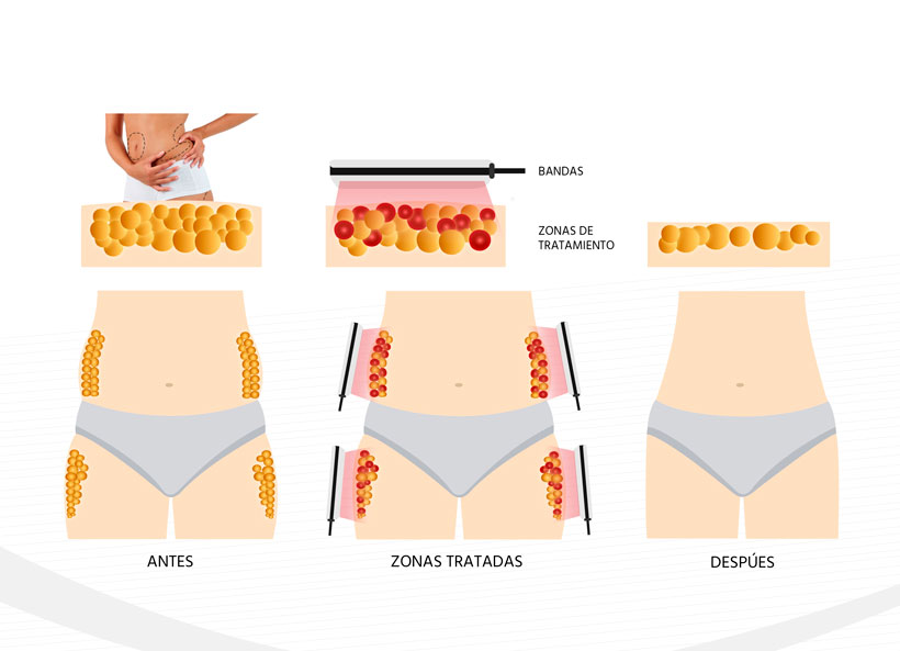 Láser médico no invasivo, el cual penetra de forma indolora al tejido adiposo subcutáneo, produciendo el paso de estado solido de la grasa a uno líquido, la cual sera eliminada por via linfática, teniendo una reducción inmediata de medidas, así como la notable disminución de flacidez. Este sistema está indicado en todas las áreas del cuerpo y en papada, su piel se tornara con mayor firmeza y lozanía, debido al estímulo de los tejidos de sosten (colágeno/elastina).